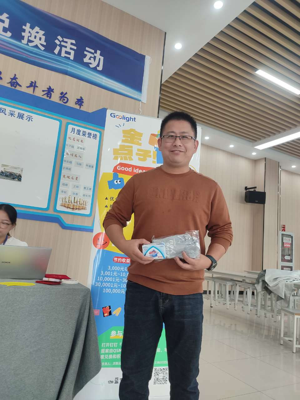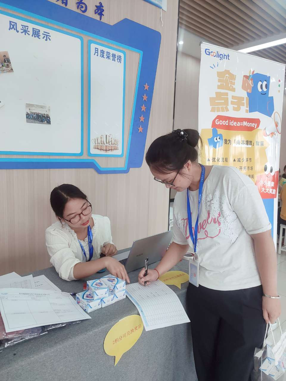 活动当天准备了众多积分兑换礼品,包括购物卡、烤箱、电锅、羊绒围巾、U型枕、雨伞、手套、牙刷和香皂。员工通过成功提案积攒的积分即可兑换相应的礼品,其中几款热门礼品,活动刚开始就被兑换一空,火爆程度超乎想象。